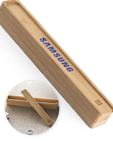 Estojo em bambu natural para uma esferográfica. O estojo tem uma tampa de correr também em bambu. Fornecido em sleeve em papel kraft reciclado. A cor e o resultado da impressão nos materiais naturais pode variar entre produtos. 24 x 152 x 23 mm