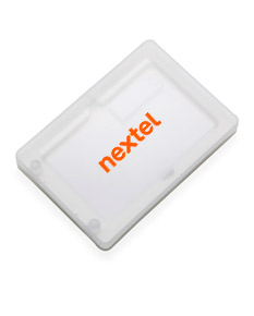 Estojo para pen drive Pico A em plástico transparente com parte interna revestida de espuma, fecha por encaixe.