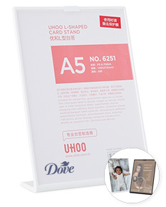 Expositor porta-retrato no formato A5, produzido em poliestireno, com placa frontal em acrílico transparente que protege e valoriza a imagem exposta. Ideal para organização e apresentação de materiais visuais em ambientes diversos.