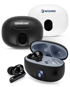 Fones de ouvido wireless em ABS 100% reciclado, com transmissão BT v5.4. A caixa de carregamento tem uma tela digital que mostra o nível de carga e tem uma capacidade de 200 mAh, oferecendo uma autonomia, aproximada, de 4h. Os fones de ouvido permitem atender chamadas, controlar o volume e a playlist do dispositivo móvel. Incluso um cabo de carregamento USB-C