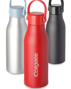 Garrafa em alumínio, tampa em plástico com alça na cor do produto. Capacidade de 550ml, pintura fosca.