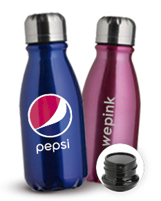 Garrafa em alumínio com tampa rosqueável e capacidade máxima de 400ml.