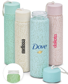 Garrafa de vidro 330ml com acabamento adesivado, tampa plástica e alça de algodão para transporte.