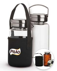 Garrafa de vidro borossilicato com capacidade de 650ml, acompanha peneira infusora e capa de neoprene com alça para transporte. Tampa de alumínio com alça para transporte.