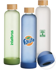 Garrafa de vidro borossilicato com capacidade de 1 litro. Contém tampa de bambu e base de silicone anti-impacto (removível).