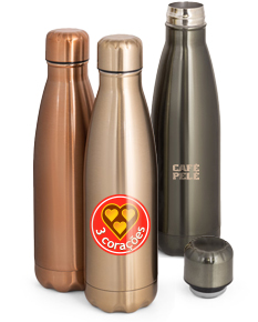 Garrafa em aço inox de parede dupla térmica, isolada a vácuo. Garrafa com acabamento metalizado e tampa em aço inox. Todas as componentes da garrafa - tampa, corpo e base - na mesma cor. Capacidade até 510 mL. Certificação EU Food Grade. ø70 x 255 mm
