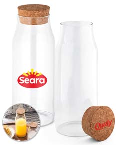 Garrafa de vidro borosilicato com tampa de cortiça. Capacidade até 1L.