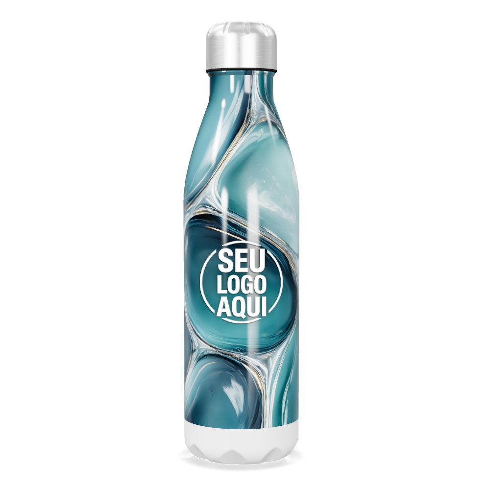 "Garrafa Inox com capacidade para 750ml em um tom de azul abstrato moderno e sofisticado. Ideal para manter suas bebidas sempre na temperatura certa, seja para um dia na praia, academia ou no escritório. Leve, prática e sustentável, essa garrafa é a escolha perfeita para te acompanhar em todas as suas atividades diárias."