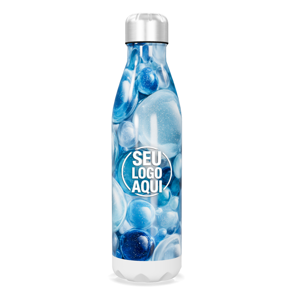 Para estilo: garrafa com design moderno e elegante, com bolhas azuis para adicionar um toque de personalidade.