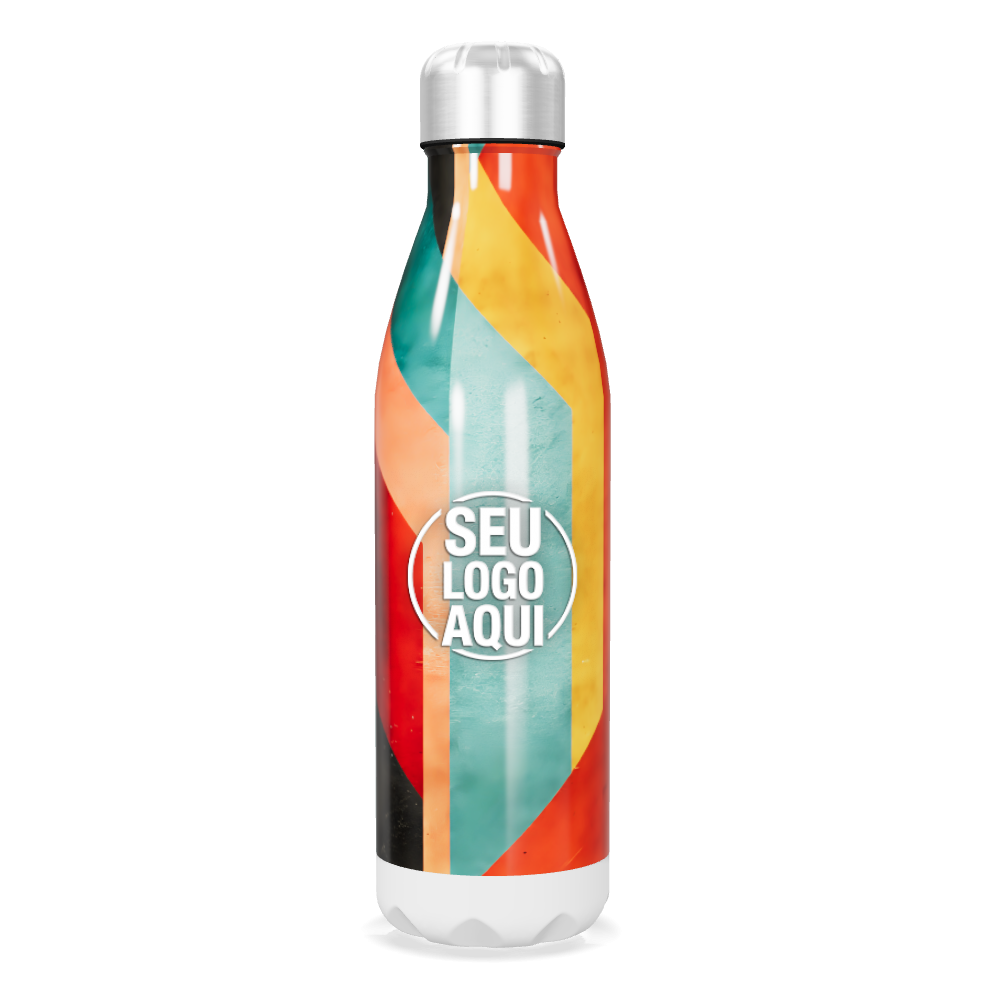 garrafa inox colorida com design geométrico personalizada