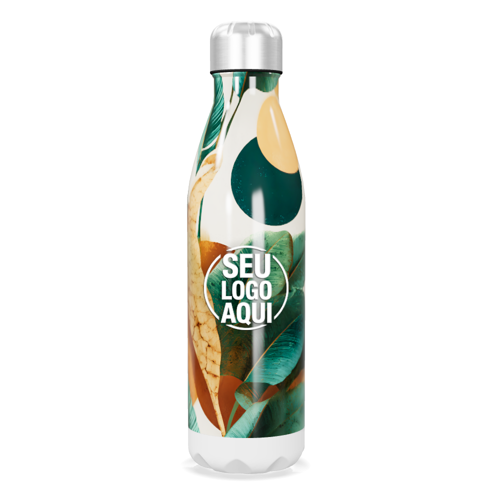 Garrafa de aço inoxidável com estampa vibrante de folhagem colorida, perfeita para manter suas bebidas favoritas sempre na temperatura ideal. Ideal para levar com você para o trabalho, academia ou em viagens, mantendo-se hidratado durante todo o dia com muito estilo.