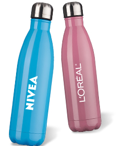 Garrafa 750ml em inox com tampa rosqueável e pintura brilhante. Obs.: Não é um modelo térmico.
