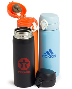 Garrafa 500ml em inox com botão e válvula para abertura. Possui um sistema de trava (basta mover para cima/baixo para abrir/fechar) pressione o botão central para abrir a tampa.