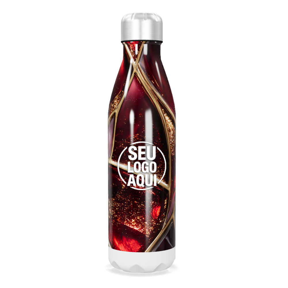 garrafa inox vermelha com detalhes dourados personalizada