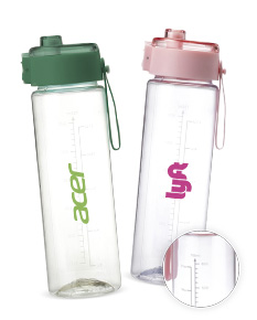 Garrafa feita em plástico livre de BPA com capacidade máxima de 750ml e marcação de volume impressa de até 700ml. Possui tampa rosqueável em polipropileno (PP) com protetor para o bocal, botão de acionamento e alça de mão em silicone.