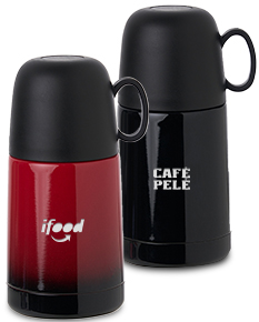 Garrafa térmica 250ml com acabamento degradê, contém tampa hermética rosqueável com botão de acionamento e tampa externa plástica com alça, podendo ser utilizada como xícara.