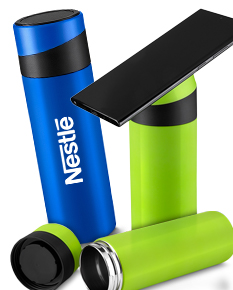 Garrafa em aço inox parede dupla 400 ml, conserva a temperatura quente ou fria, com apoio para celular na tampa.