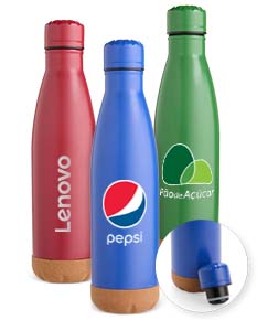 Garrafa térmica feita em inox com fundo em cortiça, tampa de plástico rosqueável e capacidade máxima de até 500ml. Apresenta estrutura de parede dupla e vedação a vácuo, o que permite a manutenção da temperatura de líquidos por mais tempo.