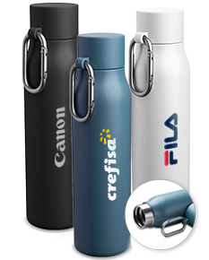 Garrafa térmica de 550 ml com parede dupla em inox reciclado, sendo externo 304 e interno 201, que auxilia na conservação da temperatura das bebidas. Possui tampa em plástico PP, mosquetão em alumínio para fácil transporte e acabamento com pintura a pó, unindo resistência, praticidade e visual moderno, ideal como brinde corporativo sustentável.