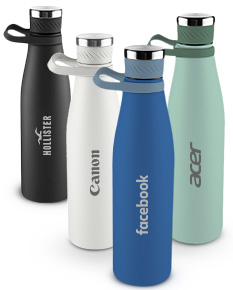 Garrafa térmica de 750 ml com parede dupla em inox (interno 304 / externo 201), acabamento com pintura a pó e tampa em inox 201 com anel de silicone para vedação, possui alça em silicone para transporte.