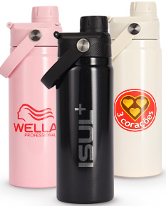 Garrafa térmica em inox de 600ml, com parede dupla e isolamento a vácuo para manter a temperatura de bebidas por mais tempo. Conta com tampa plástica rosqueável com proteção para o bocal e alça fixa para transporte. Brinde durável, funcional e ideal para uso diário.