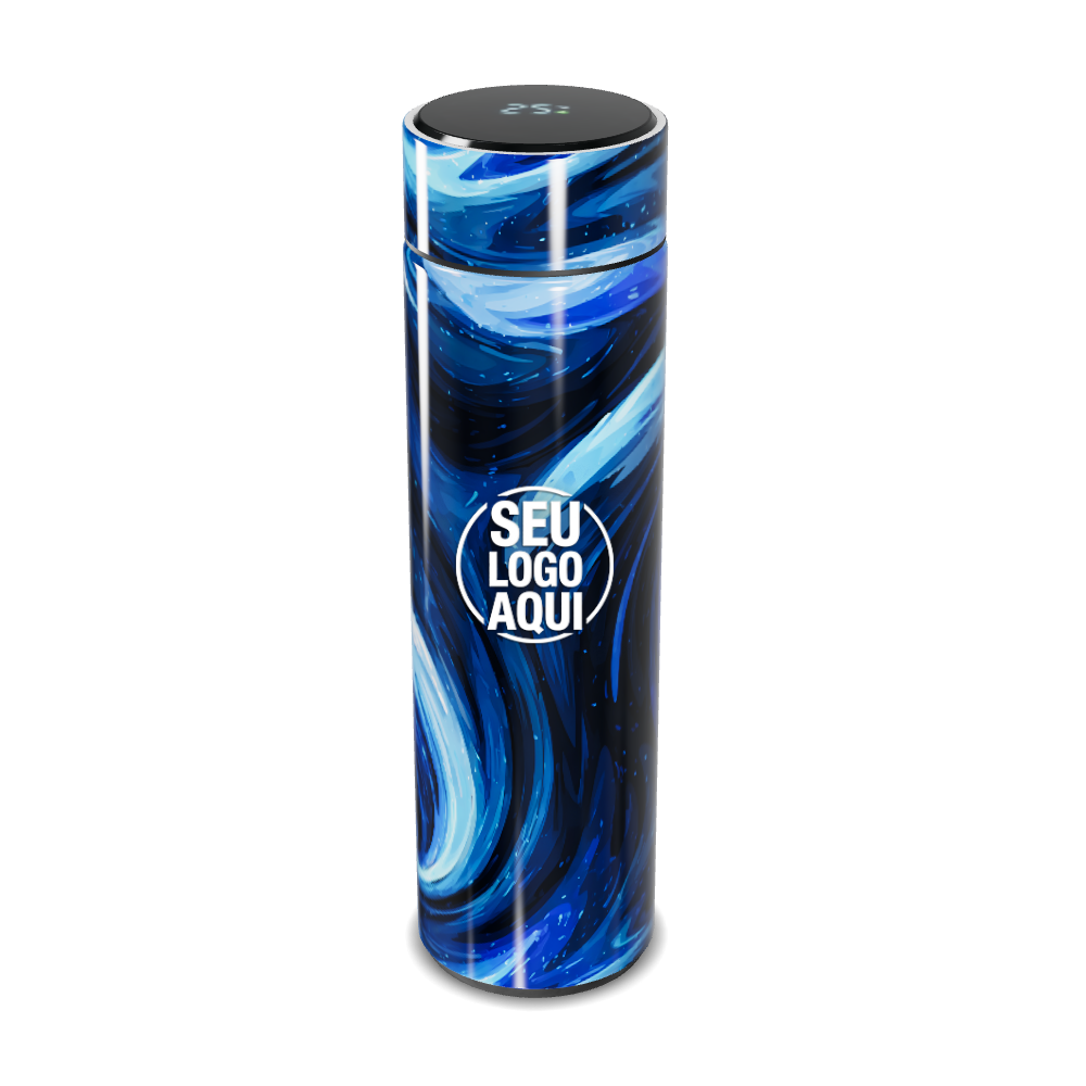 Garrafa térmica em aço inox com parede dupla 450ml com infusor, Display LED com termômetro digital na tampa para indicar a temperatura do líquido, Conserva líquido quente por até 5 horas e líquido frio até 7 horas