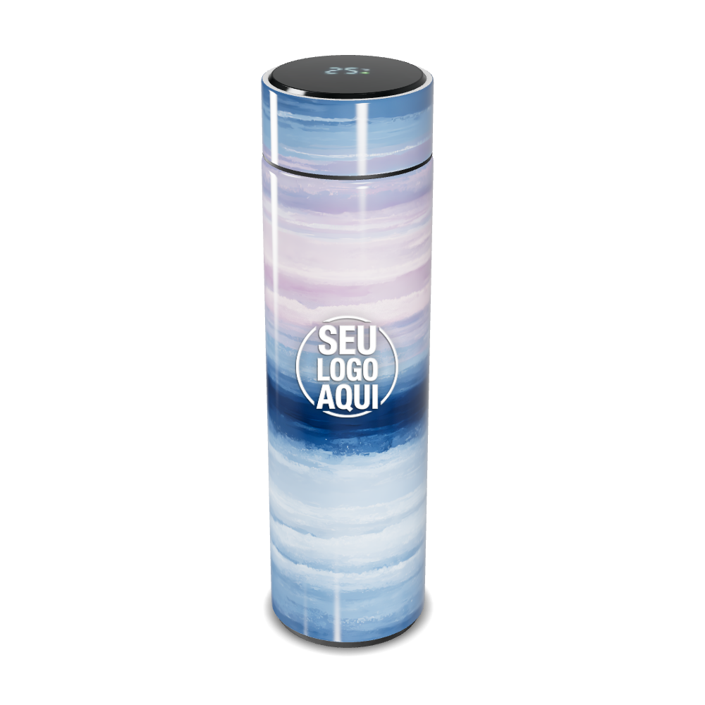 Garrafa térmica em aço inox com parede dupla 450ml com infusor, Display LED com termômetro digital na tampa para indicar a temperatura do líquido, Conserva líquido quente por até 5 horas e líquido frio até 7 horas