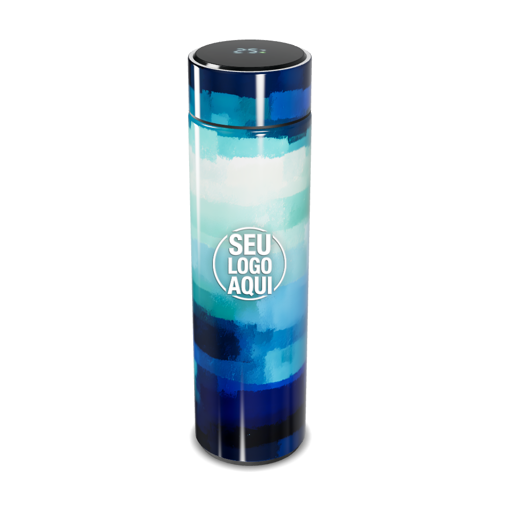 Garrafa térmica em aço inox com parede dupla 450ml com infusor, Display LED com termômetro digital na tampa para indicar a temperatura do líquido, Conserva líquido quente por até 5 horas e líquido frio até 7 horas
