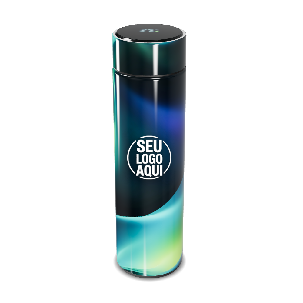 Garrafa térmica em aço inox com parede dupla 450ml com infusor, Display LED com termômetro digital na tampa para indicar a temperatura do líquido, Conserva líquido quente por até 5 horas e líquido frio até 7 horas