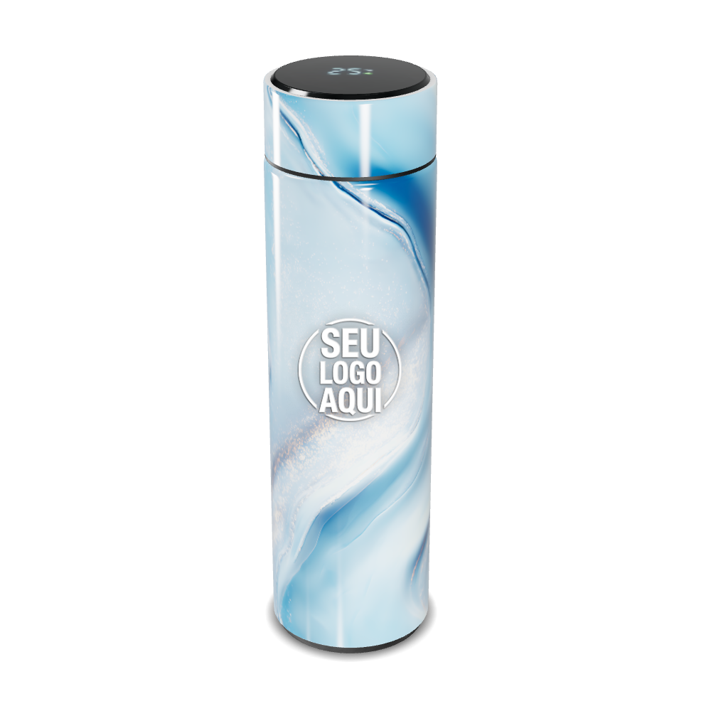 Garrafa térmica em aço inox com parede dupla 450ml com infusor, Display LED com termômetro digital na tampa para indicar a temperatura do líquido, Conserva líquido quente por até 5 horas e líquido frio até 7 horas