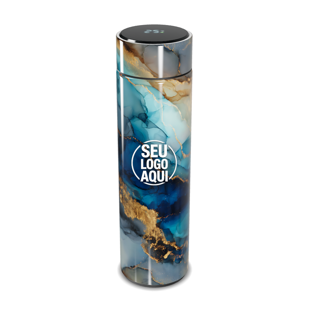 Garrafa térmica em aço inox com parede dupla 450ml com infusor, Display LED com termômetro digital na tampa para indicar a temperatura do líquido, Conserva líquido quente por até 5 horas e líquido frio até 7 horas