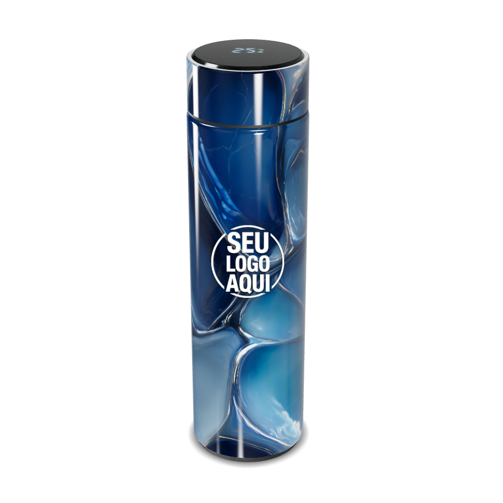 Garrafa térmica em aço inox com parede dupla 450ml com infusor, Display LED com termômetro digital na tampa para indicar a temperatura do líquido, Conserva líquido quente por até 5 horas e líquido frio até 7 horas