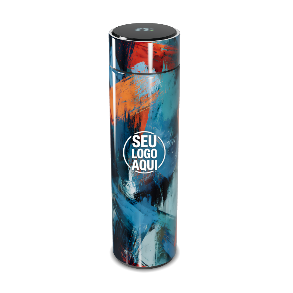 Garrafa térmica em aço inox com parede dupla 450ml com infusor, Display LED com termômetro digital na tampa para indicar a temperatura do líquido, Conserva líquido quente por até 5 horas e líquido frio até 7 horas