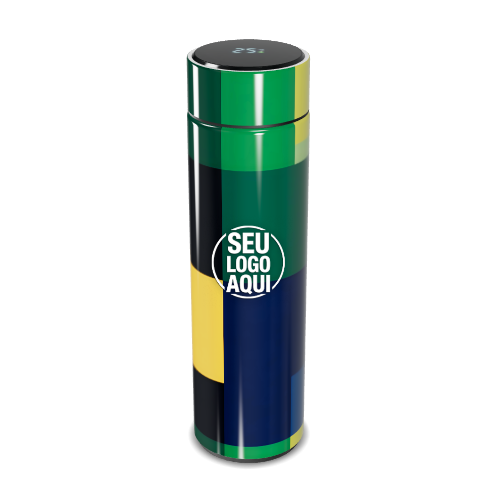 Garrafa térmica em aço inox com parede dupla 450ml com infusor, Display LED com termômetro digital na tampa para indicar a temperatura do líquido, Conserva líquido quente por até 5 horas e líquido frio até 7 horas