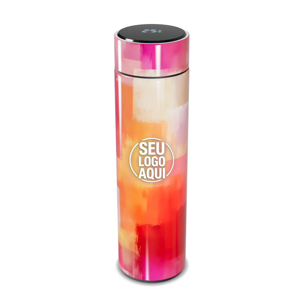 Garrafa térmica em aço inox com parede dupla 450ml com infusor, Display LED com termômetro digital na tampa para indicar a temperatura do líquido, Conserva líquido quente por até 5 horas e líquido frio até 7 horas