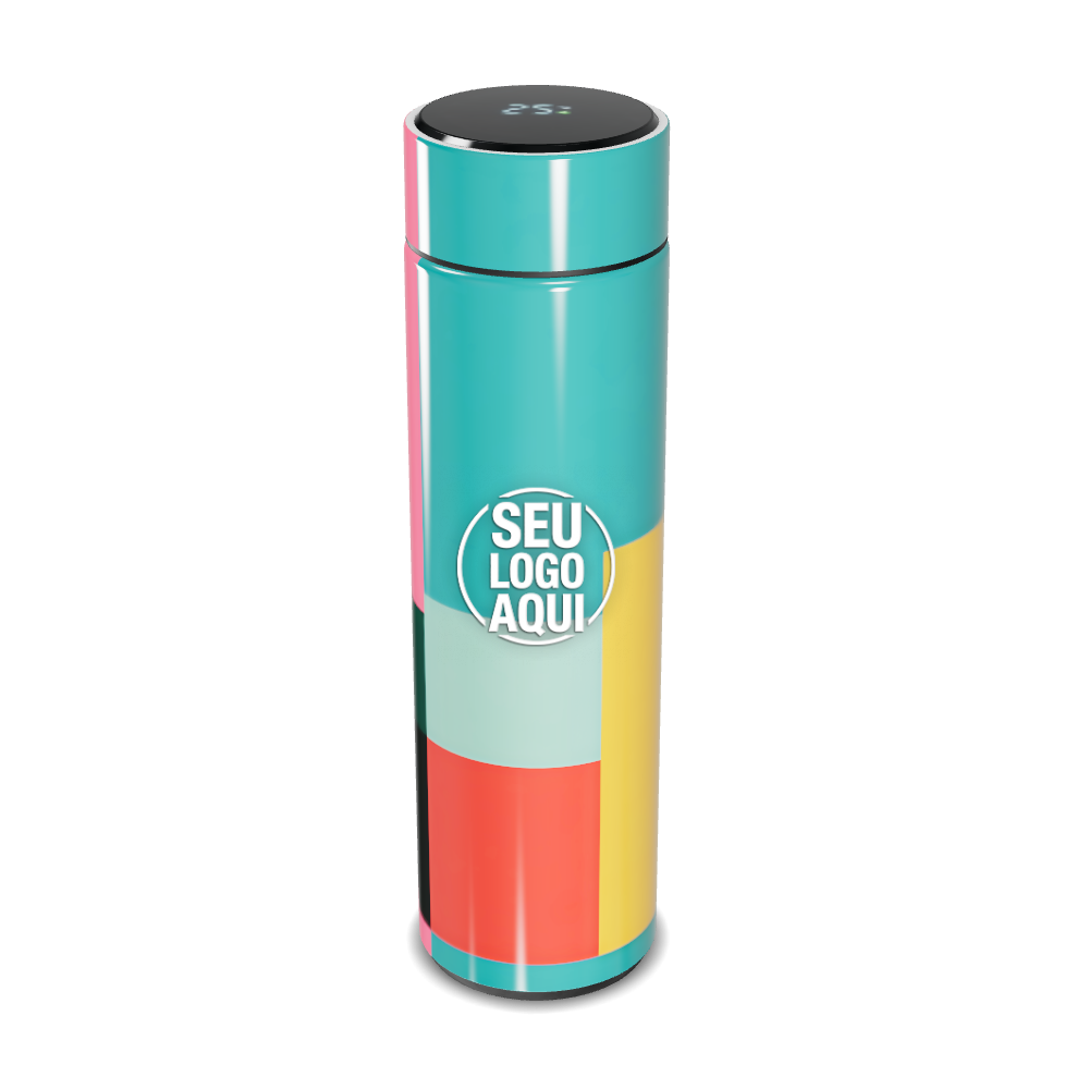 Garrafa térmica em aço inox com parede dupla 450ml com infusor, Display LED com termômetro digital na tampa para indicar a temperatura do líquido, Conserva líquido quente por até 5 horas e líquido frio até 7 horas