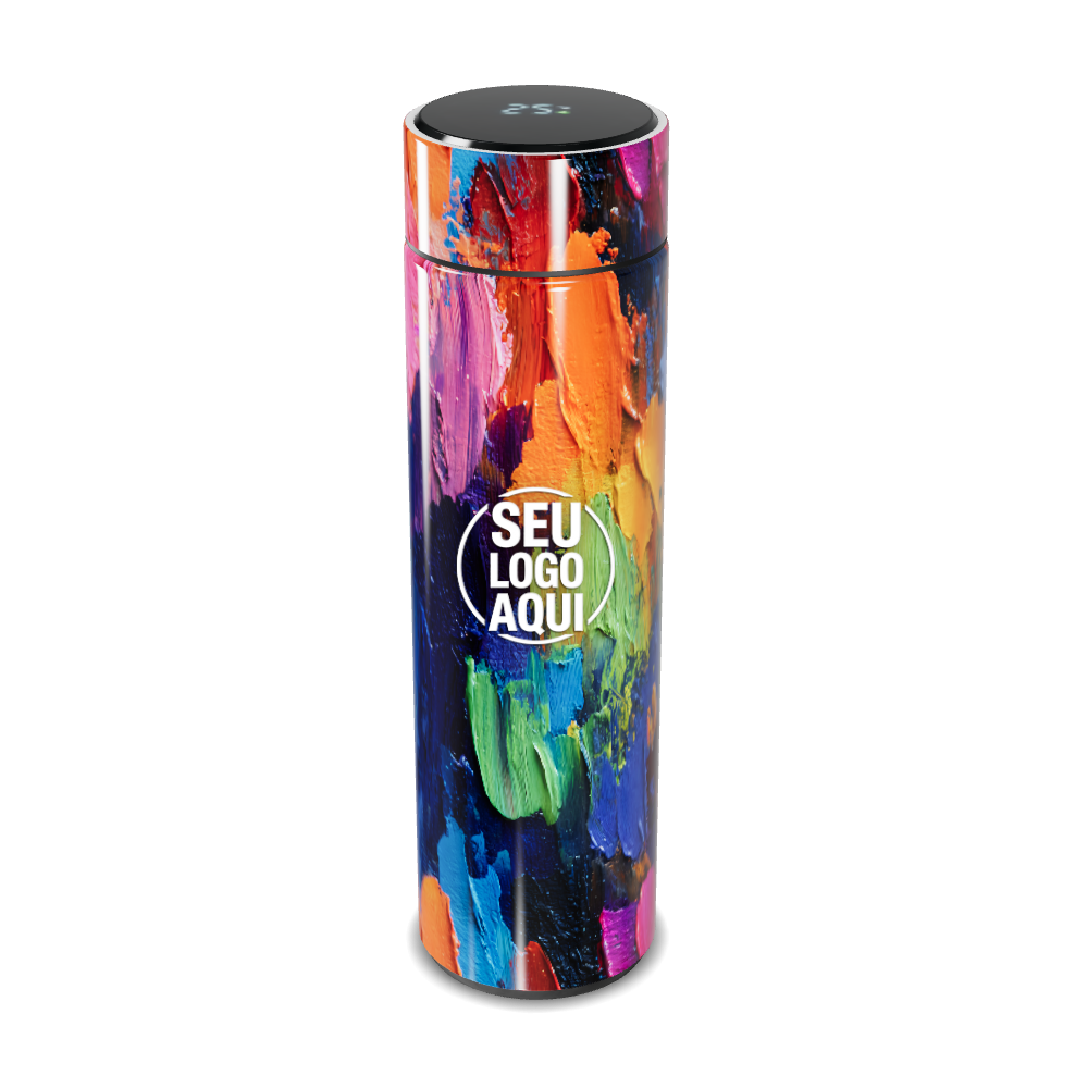 Garrafa térmica em aço inox com parede dupla 450ml com infusor, Display LED com termômetro digital na tampa para indicar a temperatura do líquido, Conserva líquido quente por até 5 horas e líquido frio até 7 horas