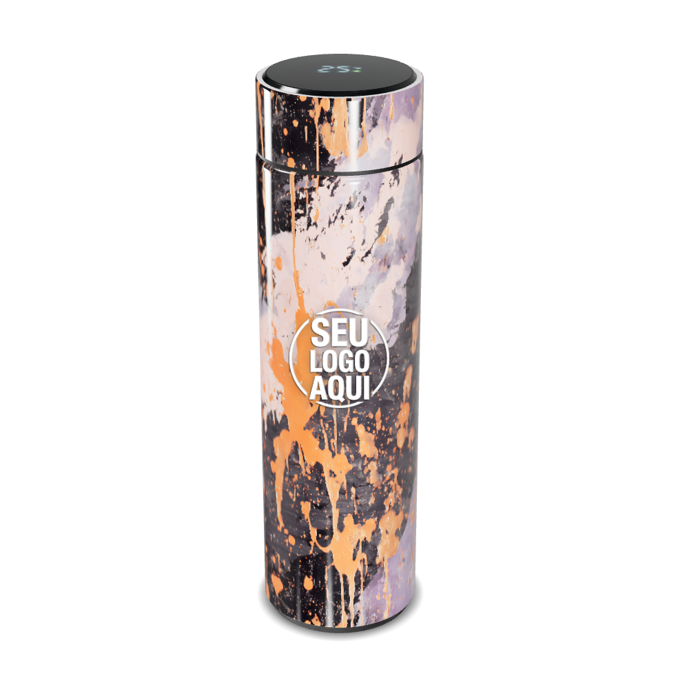 Garrafa térmica em aço inox com parede dupla 450ml com infusor, Display LED com termômetro digital na tampa para indicar a temperatura do líquido, Conserva líquido quente por até 5 horas e líquido frio até 7 horas