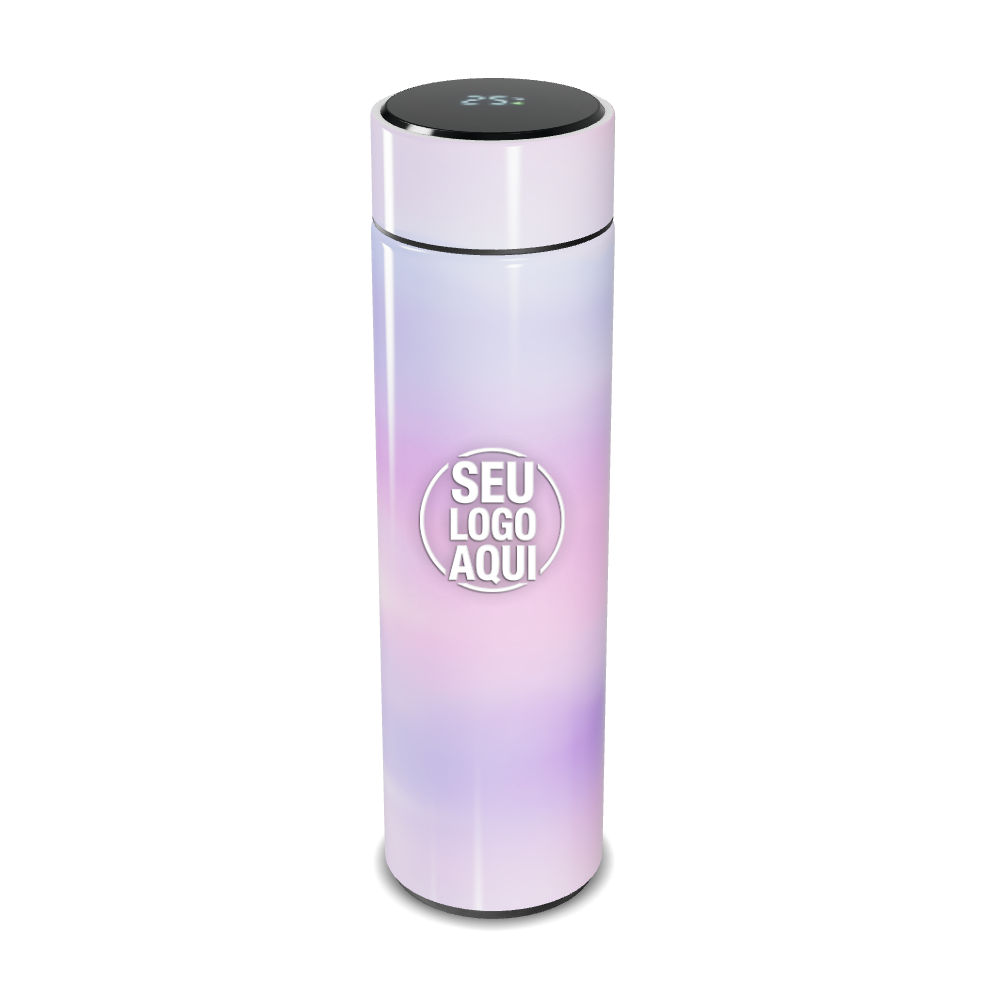 Garrafa térmica em aço inox com parede dupla 450ml com infusor, Display LED com termômetro digital na tampa para indicar a temperatura do líquido, Conserva líquido quente por até 5 horas e líquido frio até 7 horas