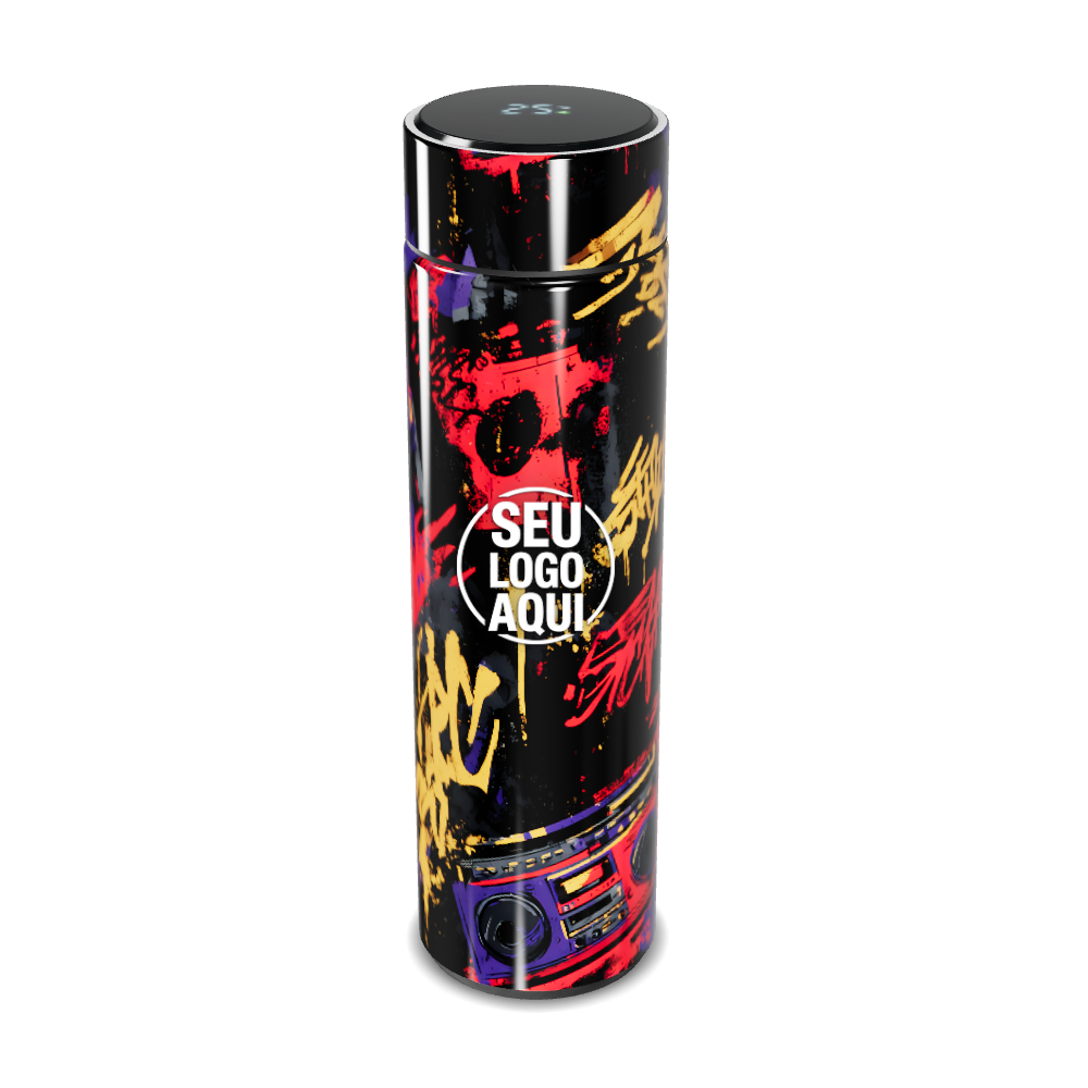 Garrafa térmica em aço inox com parede dupla 450ml com infusor, Display LED com termômetro digital na tampa para indicar a temperatura do líquido, Conserva líquido quente por até 5 horas e líquido frio até 7 horas