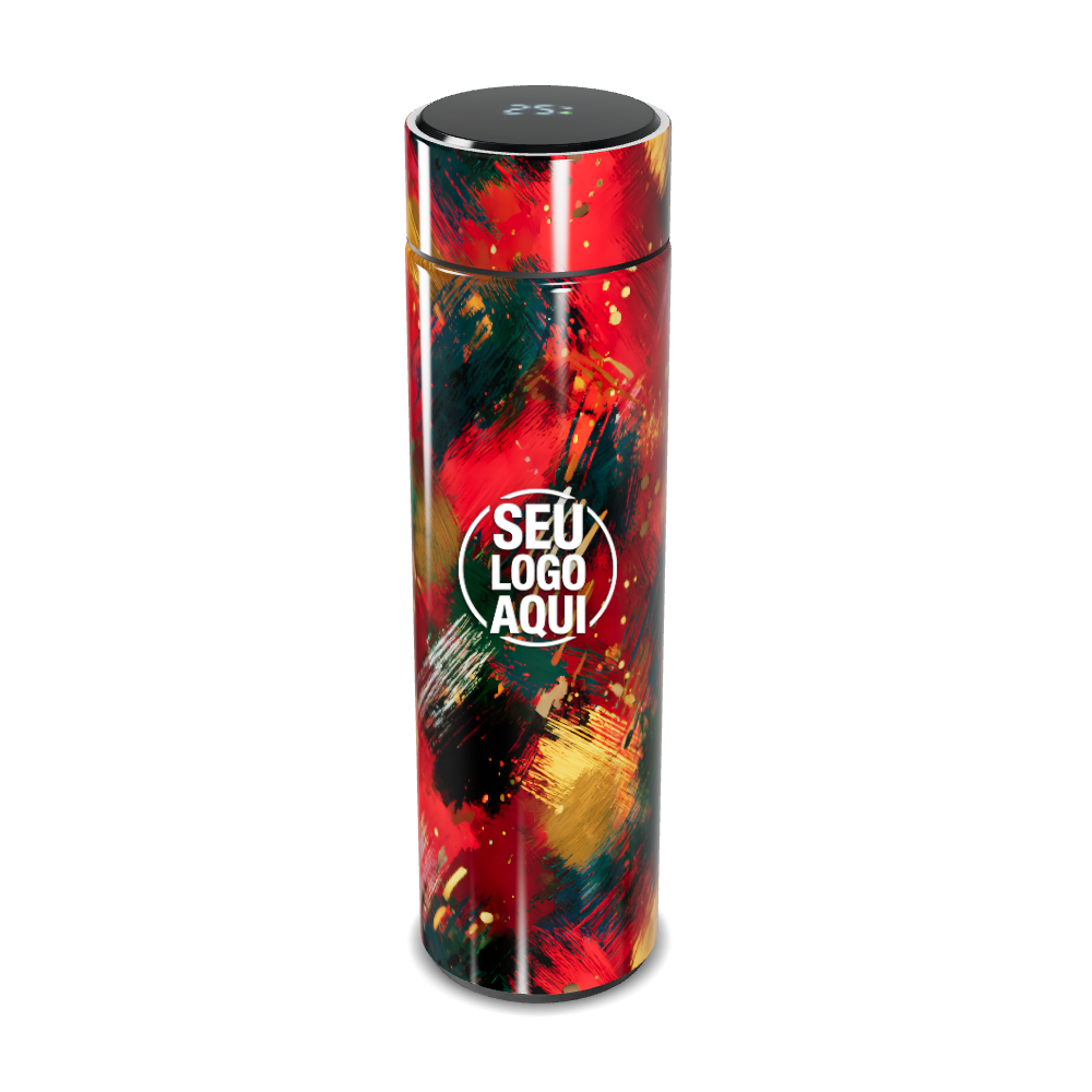 Garrafa térmica em aço inox com parede dupla 450ml com infusor, Display LED com termômetro digital na tampa para indicar a temperatura do líquido, Conserva líquido quente por até 5 horas e líquido frio até 7 horas