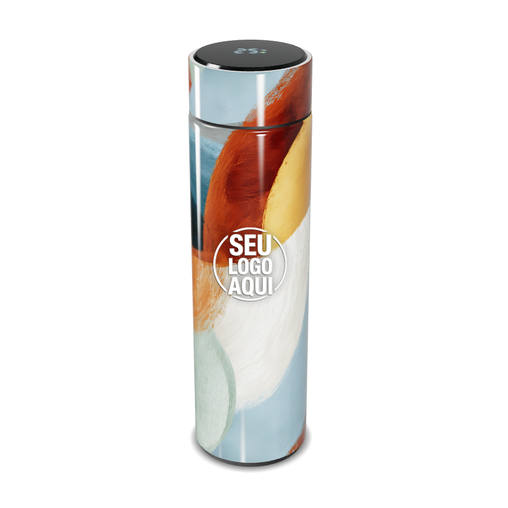 Garrafa térmica em aço inox com parede dupla 450ml com infusor, Display LED com termômetro digital na tampa para indicar a temperatura do líquido, Conserva líquido quente por até 5 horas e líquido frio até 7 horas