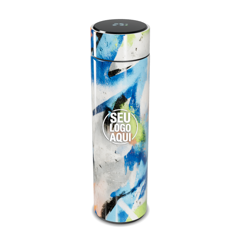 Garrafa térmica em aço inox com parede dupla 450ml com infusor, Display LED com termômetro digital na tampa para indicar a temperatura do líquido, Conserva líquido quente por até 5 horas e líquido frio até 7 horas