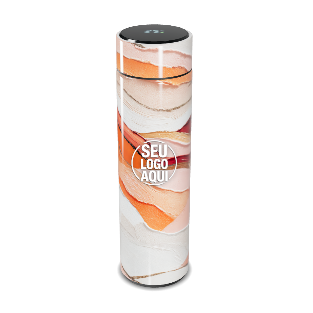Garrafa térmica em aço inox com parede dupla 450ml com infusor, Display LED com termômetro digital na tampa para indicar a temperatura do líquido, Conserva líquido quente por até 5 horas e líquido frio até 7 horas