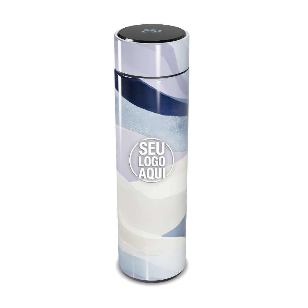 Garrafa térmica em aço inox com parede dupla 450ml com infusor, Display LED com termômetro digital na tampa para indicar a temperatura do líquido, Conserva líquido quente por até 5 horas e líquido frio até 7 horas