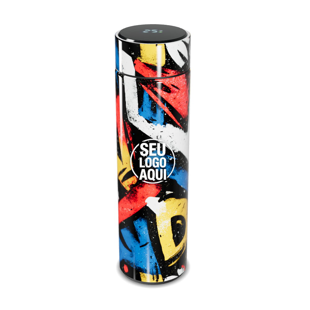 Garrafa térmica em aço inox com parede dupla 450ml com infusor, Display LED com termômetro digital na tampa para indicar a temperatura do líquido, Conserva líquido quente por até 5 horas e líquido frio até 7 horas