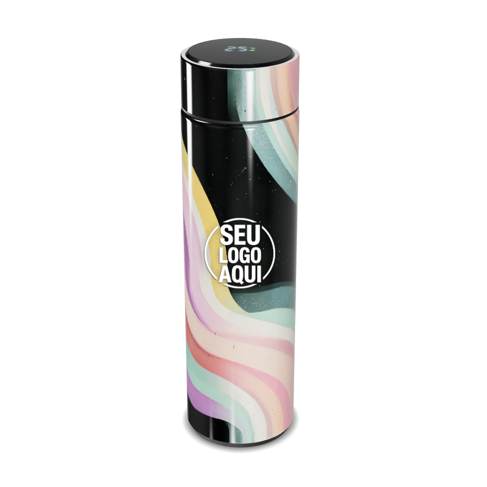 Garrafa térmica em aço inox com parede dupla 450ml com infusor, Display LED com termômetro digital na tampa para indicar a temperatura do líquido, Conserva líquido quente por até 5 horas e líquido frio até 7 horas