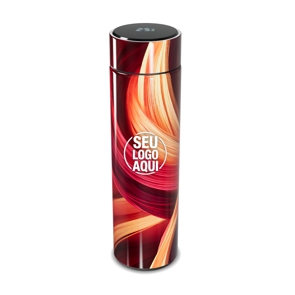 Garrafa térmica em aço inox com parede dupla 450ml com infusor, Display LED com termômetro digital na tampa para indicar a temperatura do líquido, Conserva líquido quente por até 5 horas e líquido frio até 7 horas