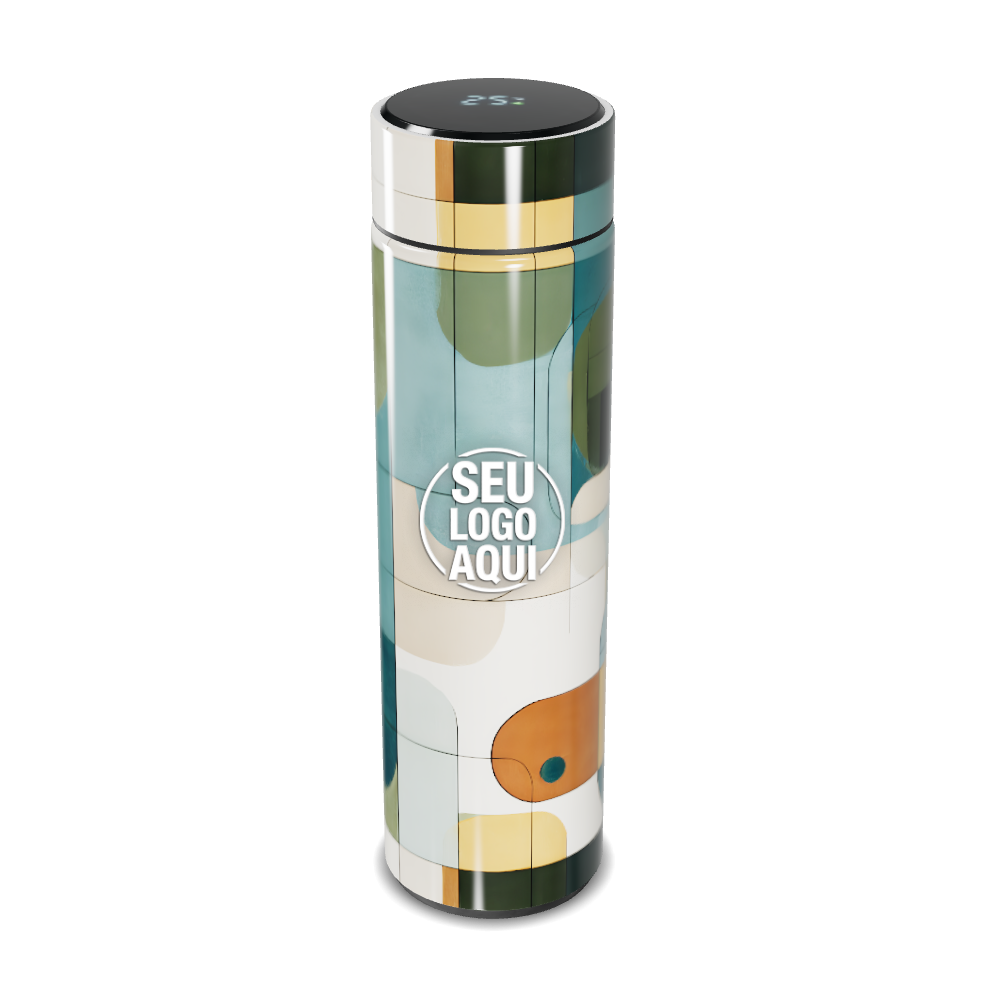 Garrafa térmica em aço inox com parede dupla 450ml com infusor, Display LED com termômetro digital na tampa para indicar a temperatura do líquido, Conserva líquido quente por até 5 horas e líquido frio até 7 horas