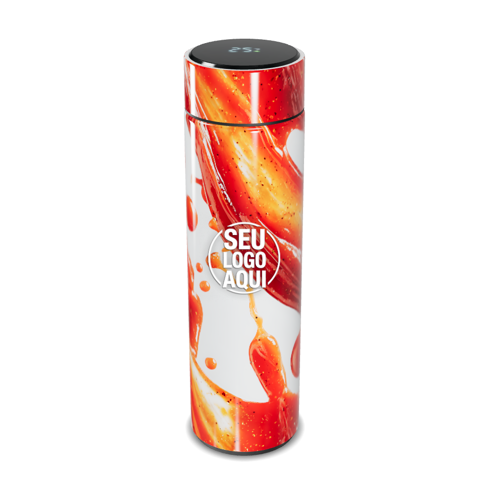 Garrafa térmica em aço inox com parede dupla 450ml com infusor, Display LED com termômetro digital na tampa para indicar a temperatura do líquido, Conserva líquido quente por até 5 horas e líquido frio até 7 horas